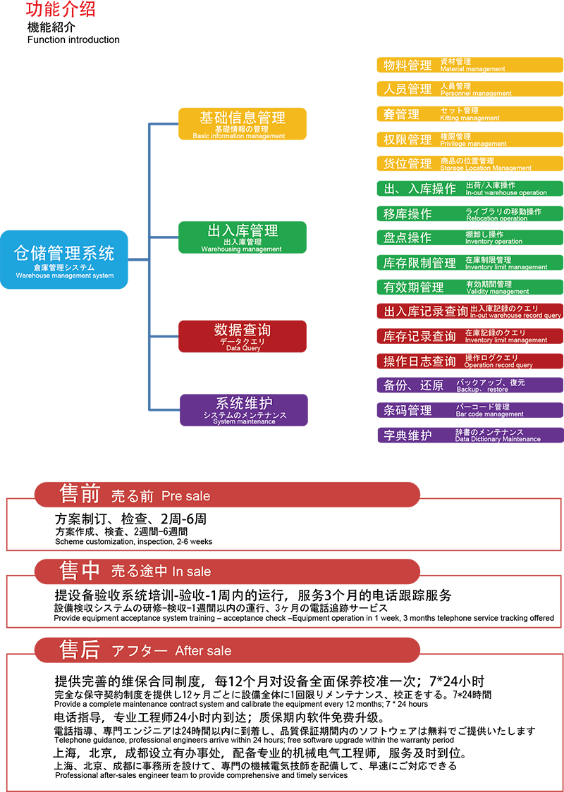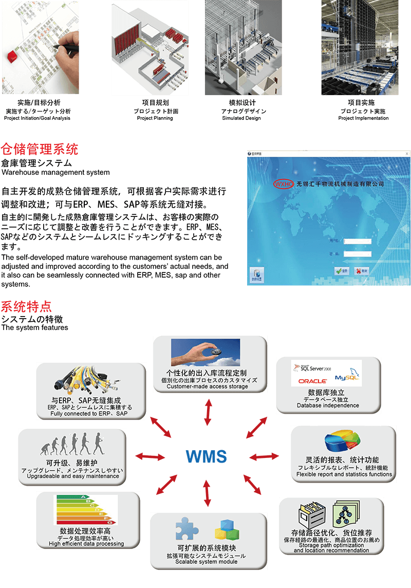Al centro dell'approccio di Wuxi Huiqian è il suo sistema di gestione del magazzino avanzato (WMS), una piattaforma flessibile che può essere personalizzata per soddisfare le esigenze specifiche di ciascun cliente. Questo sistema auto-sviluppato si integra perfettamente con ERP, MES, SAP e altri strumenti di gestione aziendale, consentendo il monitoraggio in tempo reale, il controllo dell'inventario e la migliore visibilità dei dati. Offrendo funzionalità modulari come la gestione dell'archiviazione in e out, la manutenzione del sistema e le funzionalità di query di dati, il WMS supporta le aziende nella gestione di tutto, dalle funzioni di magazzino di base alle attività logistiche più complesse.