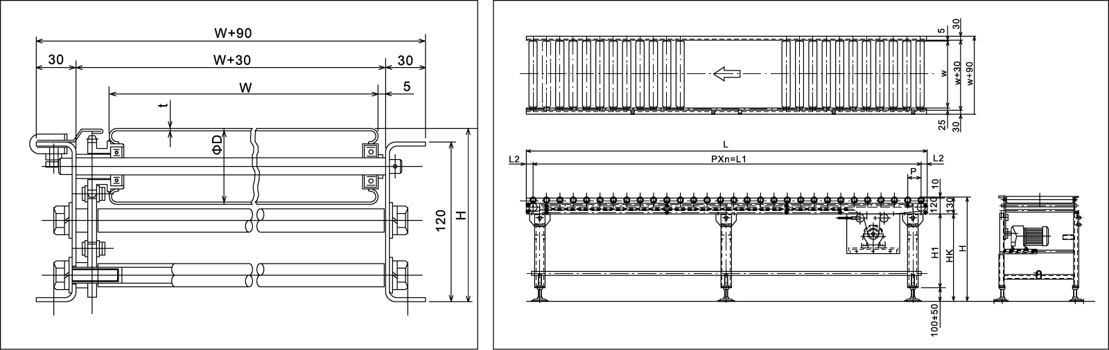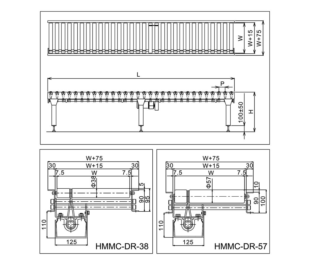 | Pitch a rulli | P (mm) | 75 · 100 · 150 | 75 · 100 · 150 | 75 · 100 · 150 | 100 · 150 | 100 · 150 |
