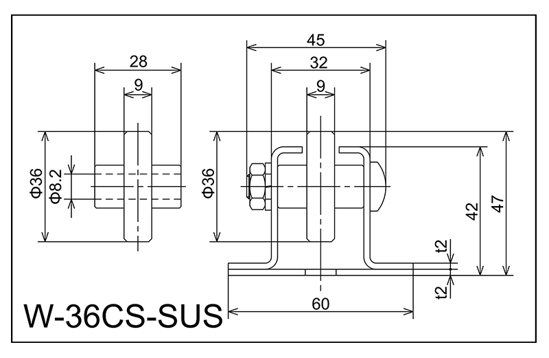 | W-36cs-SUS | 36x9x8.2x28 | M8X40L | 42x60x32x45x2.0 | 47 | 1800 · 2400 · 3000 | 50,75 · 100 · 150 | 40 | J |