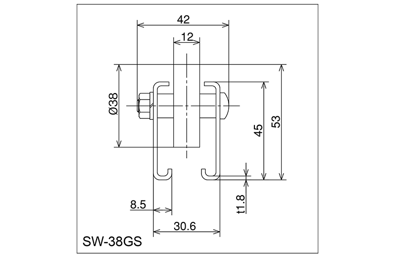 | SW-38GS | 38 × 12 × 6 × 27 | M6 × 38L | 45 × 31 × 8,5 × 42 × 1.8 | 53 | 1800 · 2400 · 3000 | 50 · 75 · 100 · 150 | 30 | Pom |